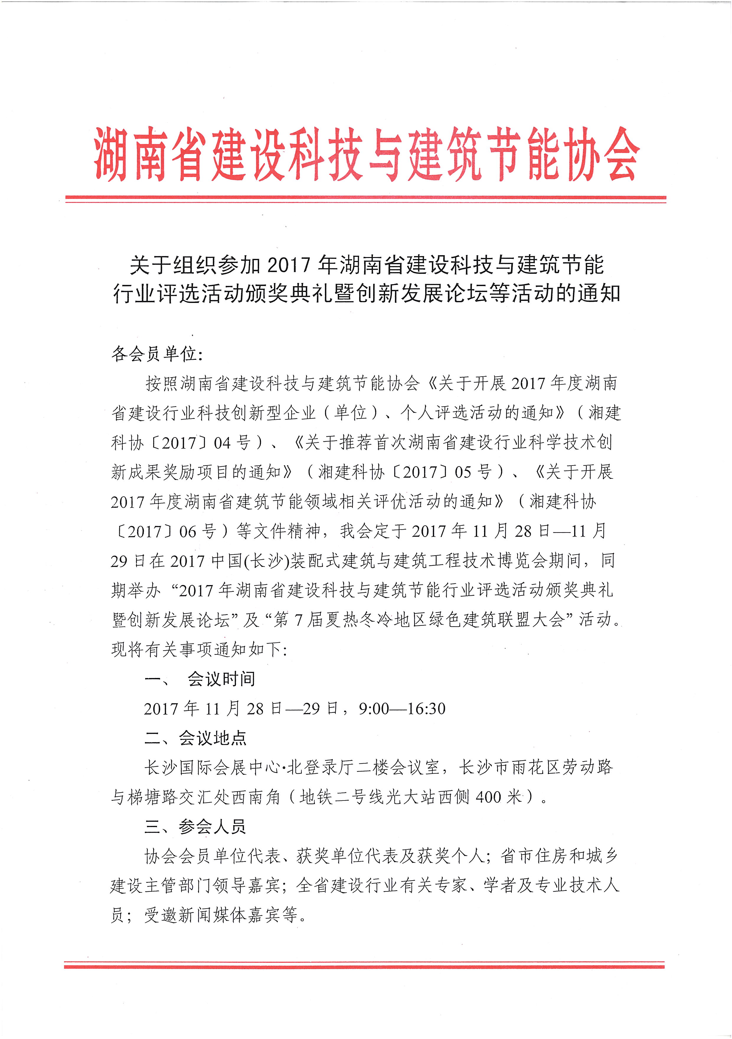关于组织参加2017年湖南省建设科技与建筑节能行业评选活动颁奖典礼暨创新发展论坛等活动的通知