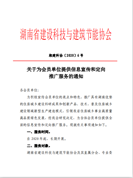 湖南省建设科技与建筑节能协会关于为会员单位提供信息宣传和定向推广服务的通知