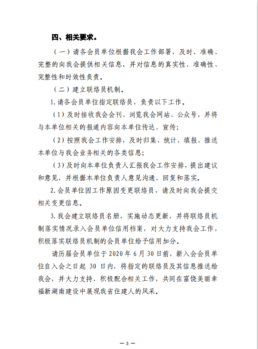 请历届会员单位于2020年6月30日前,新入会会员单位自入会之日起30日内,将指定的联络员及其信息推送给我会,并大力支持、积极配合相关工作,共同在富饶美丽幸福新湖南建设中展现我省住建人的风采。