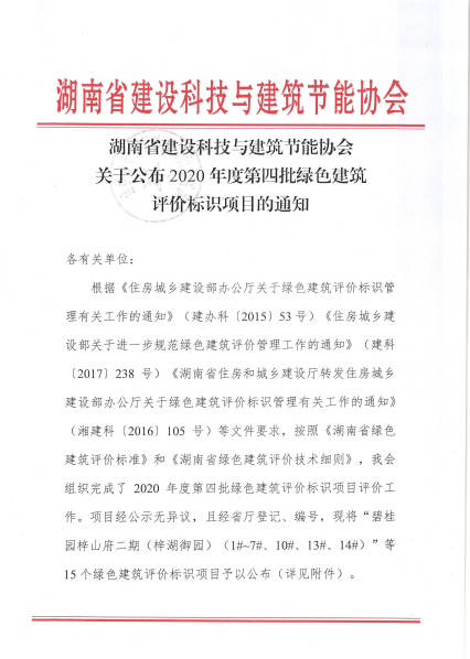 根据《住房城乡建设部办公厅关于绿色建筑评价标识管理有关工作的通知》(建办科〔2015〕53号)《住房城乡建设部关于进一步规范绿色建筑评价管理工作的通知》(建科〔2017〕238号)《湖南省住房和城乡建设厅转发住房城乡建设部办公厅关于绿色建筑评价标识管理有关工作的通知》(湘建科〔2016〕105号)等文件要求,按照《湖南省绿色建筑评价标准》和《湖南省绿色建筑评价技术细则》,我会组织完成了2020年度第四批绿色建筑评价标识项目评价工作。项目经公示无异议,且经省厅登记、编号,现将“碧桂园梓山府二期(梓湖御园)(1#~7#、10#、13#、14#)”等15个绿色建筑评价标识项目予以公布(详见附件)。