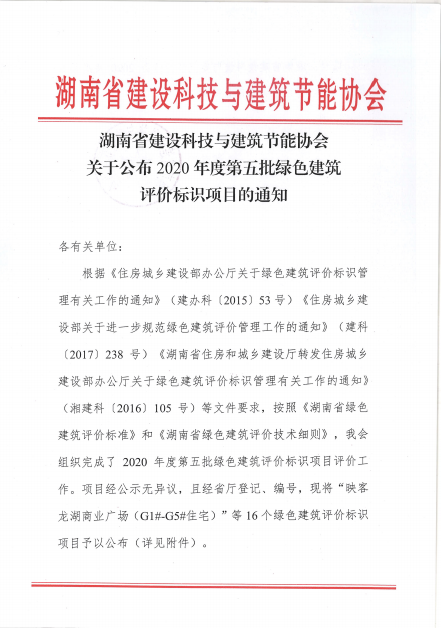 根据《住房城乡建设部办公厅关于绿色建筑评价标识管理有关工作的通知》(建办科〔2015〕53号)《住房城乡建设部关于进一步规范绿色建筑评价管理工作的通知》(建科〔2017〕238号)《湖南省住房和城乡建设厅转发住房城乡建设部办公厅关于绿色建筑评价标识管理有关工作的通知》(湘建科〔2016〕105号)等文件要求,按照《湖南省绿色建筑评价标准》和《湖南省绿色建筑评价技术细则》,我会组织完成了2020年度第五批绿色建筑评价标识项目评价工作。项目经公示无异议,且经省厅登记、编号,现将“映客龙湖商业广场(G1#-G5#住宅)”等16个绿色建筑评价标识项目予以公布(详见附件)。