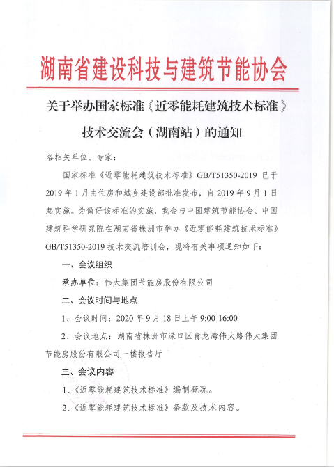 关于召开国家标准《近零能耗建筑技术标准》 技术交流会(湖南站)的通知