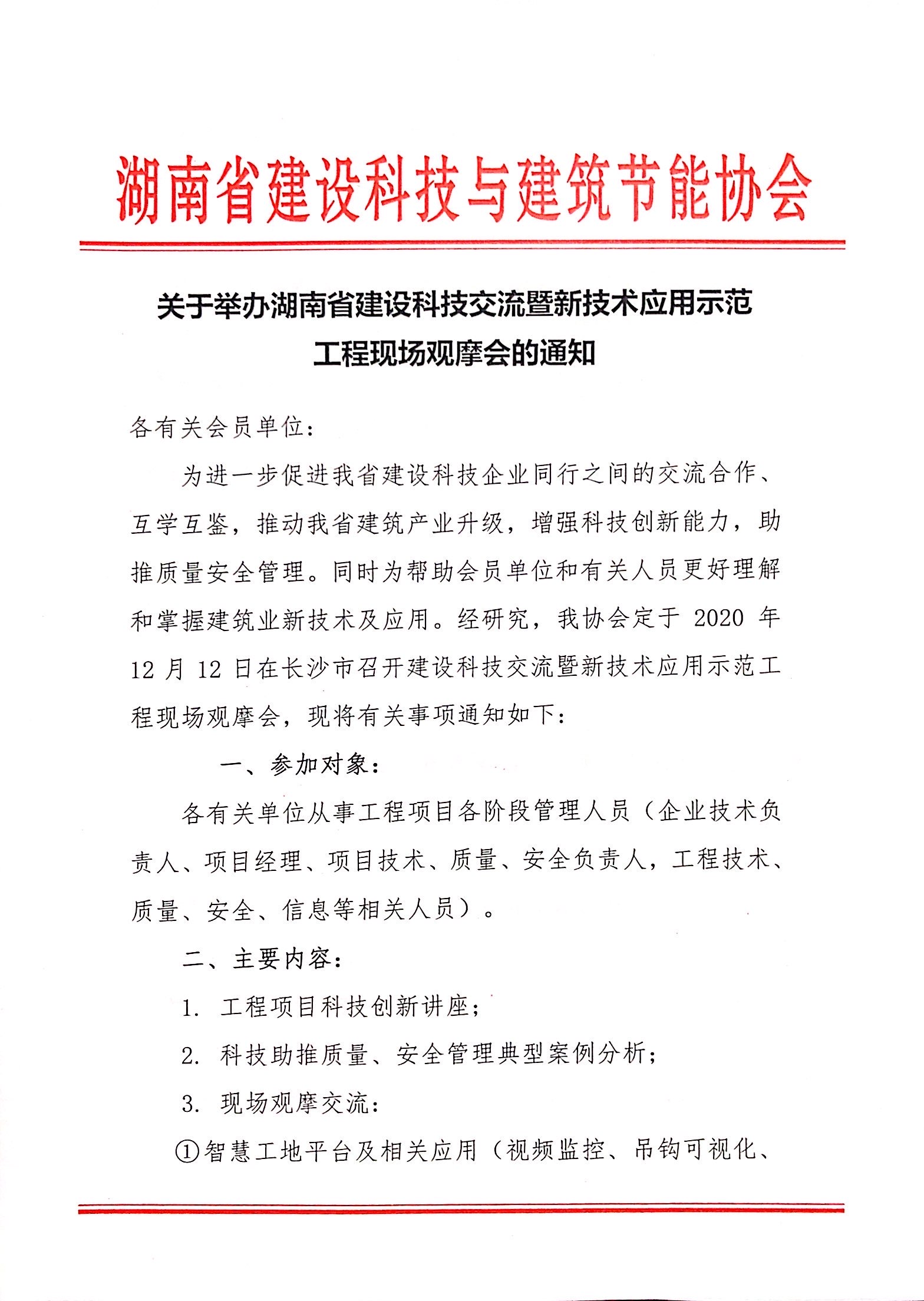 关于举办湖南省建设科技交流暨新技术应用示范工程现场观摩会的通知