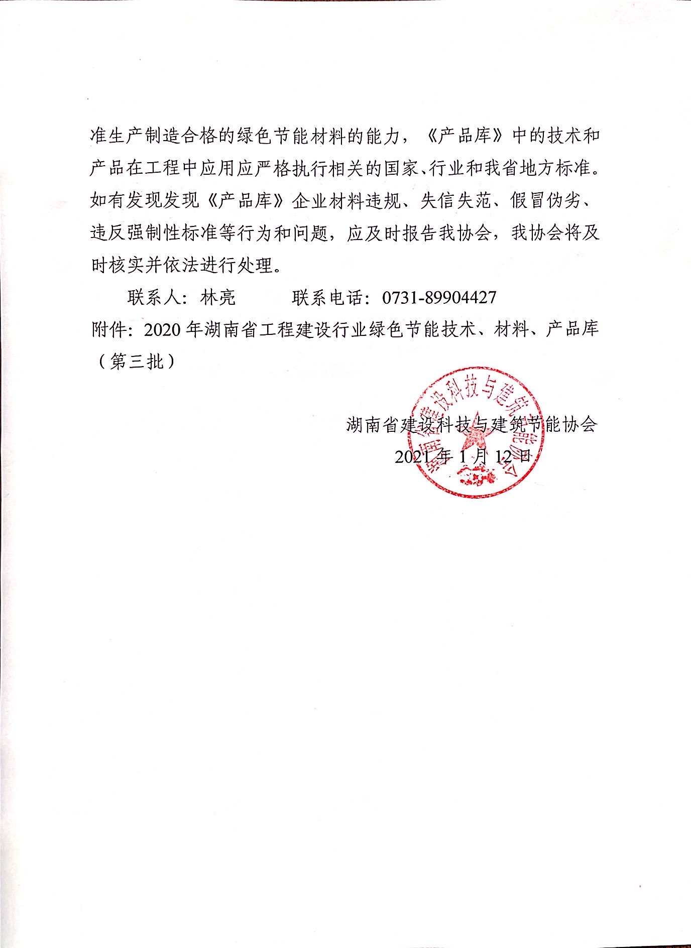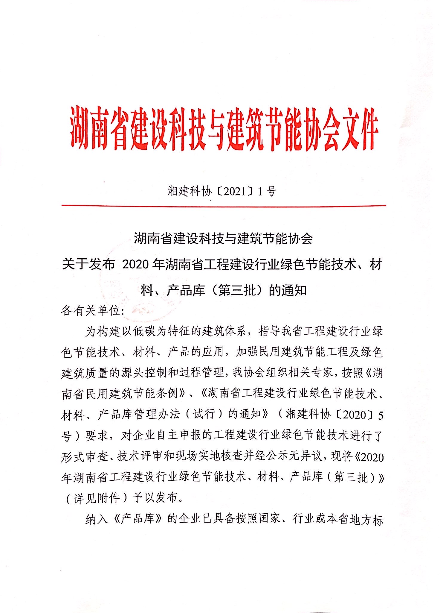 湖南省建设科技与建筑节能协会 关于发布 2020年湖南省工程建设行业绿色节能技术、材料、产品库(第三批)的通知