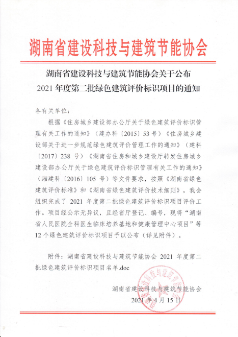 湖南省建设科技与建筑节能协会关于公布2021年度第二批绿色建筑评价标识项目的通知