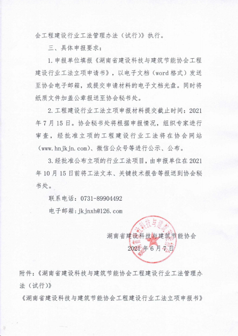 2.工程建设行业工法立项申报材料提交截止时间:2021年7月15日。协会秘书处将根据申报情况,组织专家进行审查,经批准立项的工程建设行业工法将在协会网站(www.hnjkjn.com)、微信公众号等进行公示、公布。