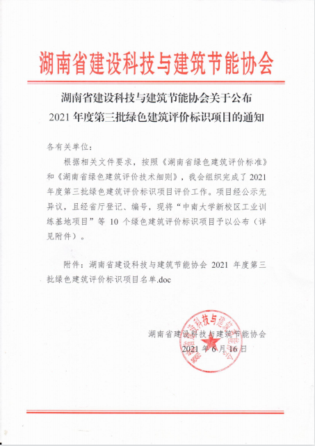 根据相关文件要求,按照《湖南省绿色建筑评价标准》和《湖南省绿色建筑评价技术细则》,我会组织完成了2021年度第三批绿色建筑评价标识项目评价工作。项目经公示无异议,且经省厅登记、编号,现将“中南大学新校区工业训练基地项目”等10个绿色建筑评价标识项目予以公布(详见附件)。