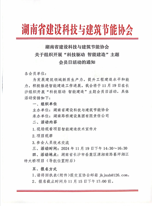湖南省建设科技与建筑节能协会关于组织开展“科技驱动 智能建造”主题会员日活动的通知