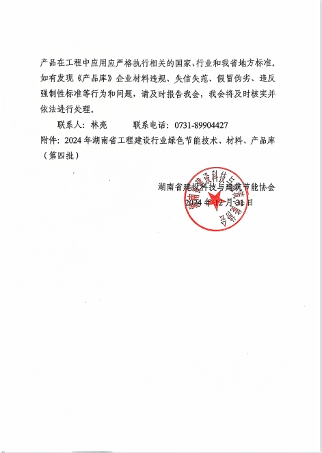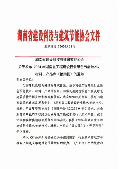 湖南省建设科技与建筑节能协会关于发布 2024年湖南省工程建设行业绿色节能技术、材料、产品库(第四批)的通知