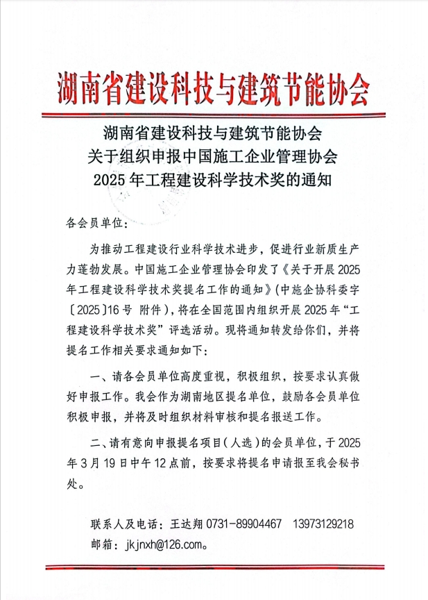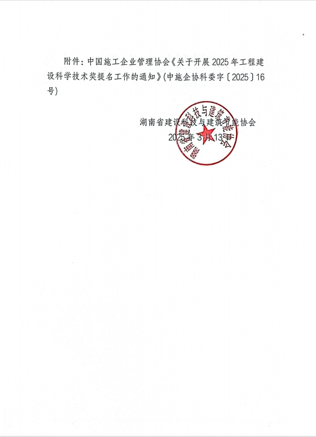 为推动工程建设行业科学技术进步,促进行业新质生产力蓬勃发展。中国施工企业管理协会印发了《关于开展2025年工程建设科学技术奖提名工作的通知》(中施企协科委字〔2025〕16号 附件),将在全国范围内组织开展2025年“工程建设科学技术奖”评选活动。现将通知转发给你们,并将提名工作相关要求通知如下: