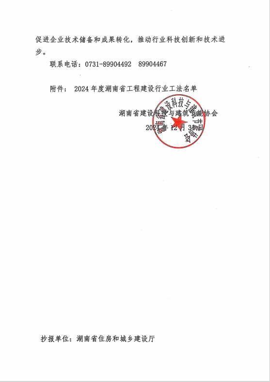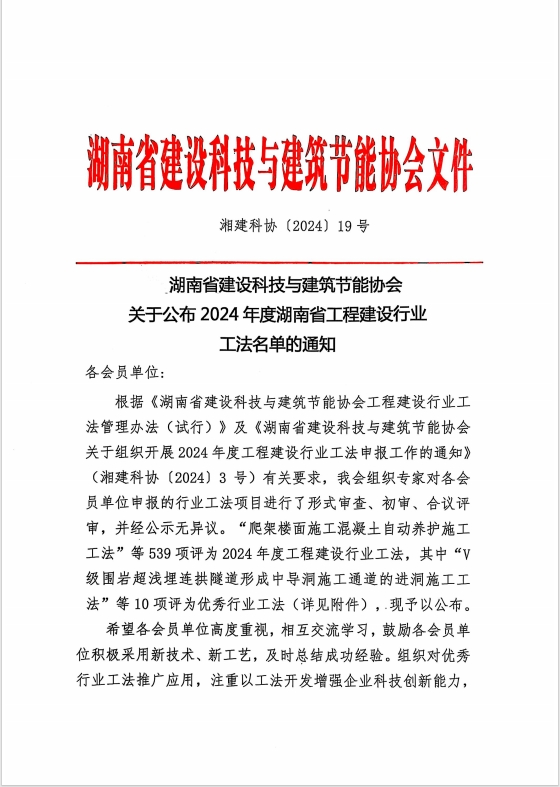 湖南省建设科技与建筑节能协会关于公布2024年度湖南省工程建设行业工法名单的通知
