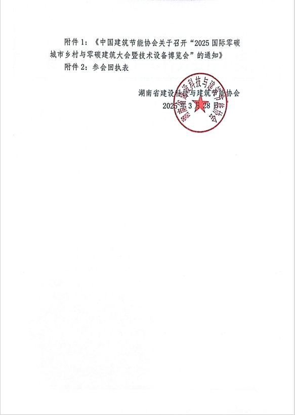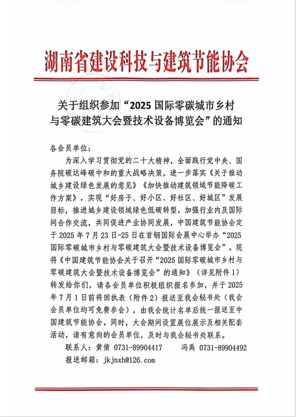 为深入学习贯彻党的二十大精神,全面践行党中央、国务院碳达峰碳中和的重大战略决策,进一步落实《关于推动城乡建设绿色发展的意见》《加快推动建筑领域节能降碳工作方案》,实现“好房子、好小区、好社区、好城区”发展目标,推进城乡建设领域绿色低碳转型,加强行业内及国际间合作交流,共同促进产业协同发展,中国建筑节能协会定于2025年7月23日-25日在首钢国际会展中心举办“2025国际零碳城市乡村与零碳建筑大会暨技术设备博览会”。现将《中国建筑节能协会关于召开“2025国际零碳城市乡村与零碳建筑大会暨技术设备博览会”的通知》(详见附件1)转发给你们,请各会员单位积极组织报名参加,并于2025年7月1日前将回执表(附件2)报送至我会秘书处(我会会员单位均可免费参会),由我会统计名单后统一报送至中国建筑节能协会。同时,大会期间设置展位展示及相关配套活动,请有意向的会员单位,及时与我会秘书处联系。