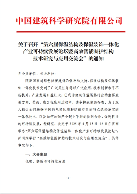 关于召开“第六届保温结构及保温装饰一体化产业可持续发展论坛暨高效智能围护结构技术研究与应用交流会”的通知