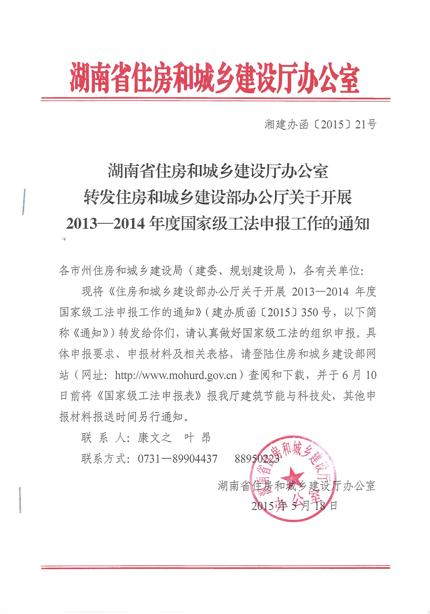 转发住房和城乡建设部办公厅关于开展2013-2014年度国家级工法申报工作的通知