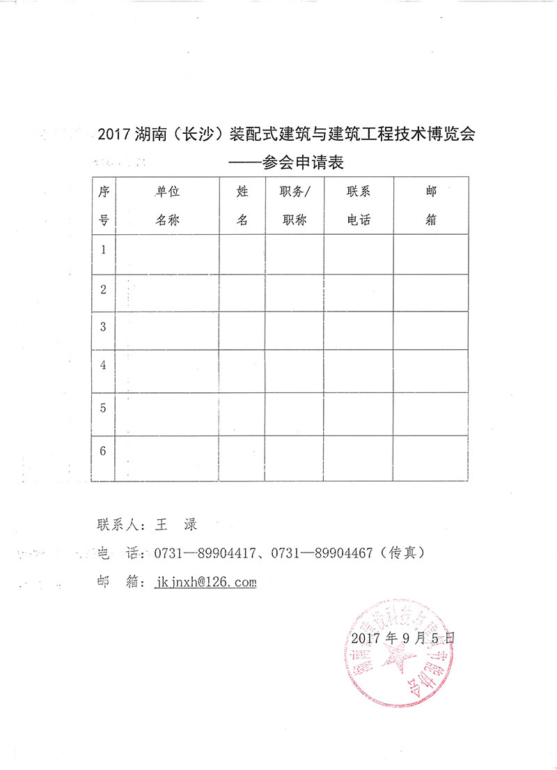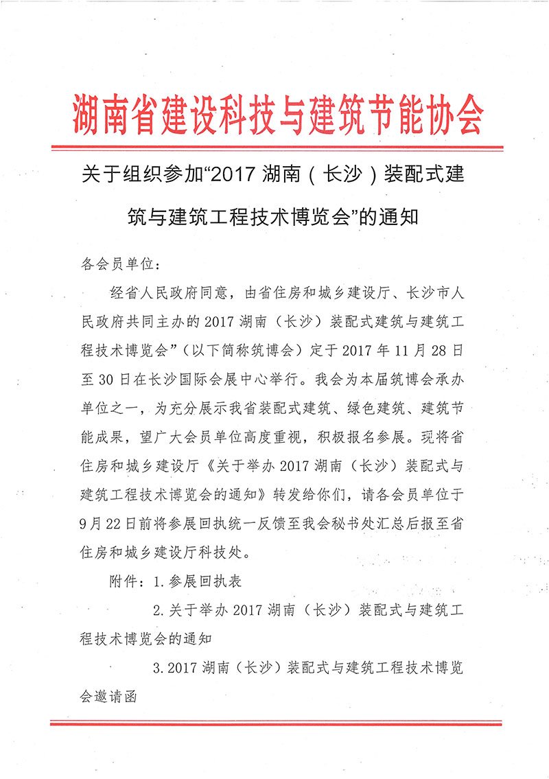 经省人民政府同意,由省住房和城乡建设厅、长沙市人民政府共同主办的2017湖南(长沙)装配式建筑与建筑工程技术博览会”(以下简称筑博会)定于2017年11月28日至30日在长沙国际会展中心举行。我会为本届筑博会承办单位之一,为充分展示我省装配式建筑、绿色建筑、建筑节能成果,望广大会员单位高度重视,积极报名参展。现将省住房和城乡建设厅《关于举办2017湖南(长沙)装配式与建筑工程技术博览会的通知》转发给你们,请各会员单位于9月22日前将参展回执统一反馈至我会秘书处汇总后报至省住房和城乡建设厅科技处。